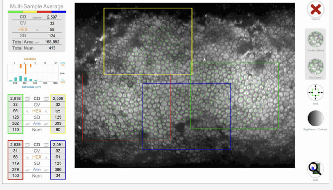• Mikroskopi Spekular – Digunakan untuk menilai viabilitas dan morfologi sel endotel kornea. Bank mata umumnya mensyaratkan kepadatan sel endotel minimal 2.000 – 2.200 sel/mm² guna memastikan daya tahan cangkok kornea yang optimal. Selain itu, pemeriksaan ini juga mengevaluasi pleomorfisme (ketidakteraturan bentuk heksagonal sel endotel) dan polimegatismus (variasi ukuran sel).