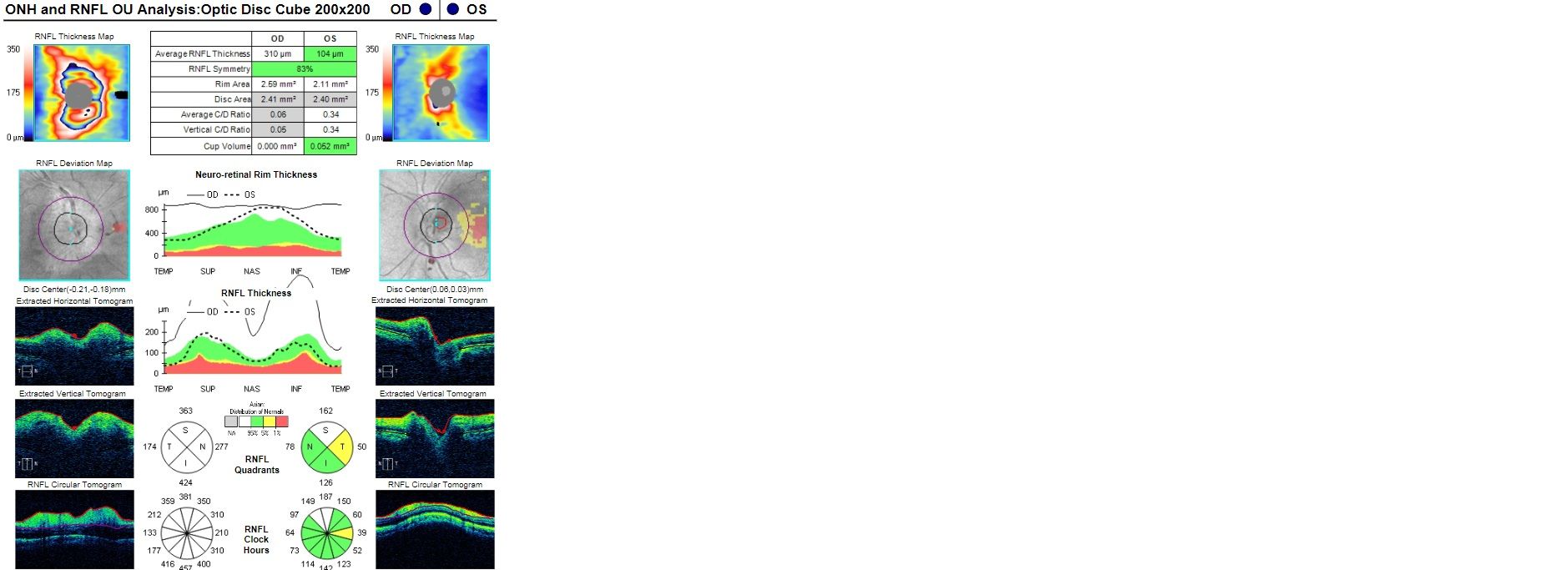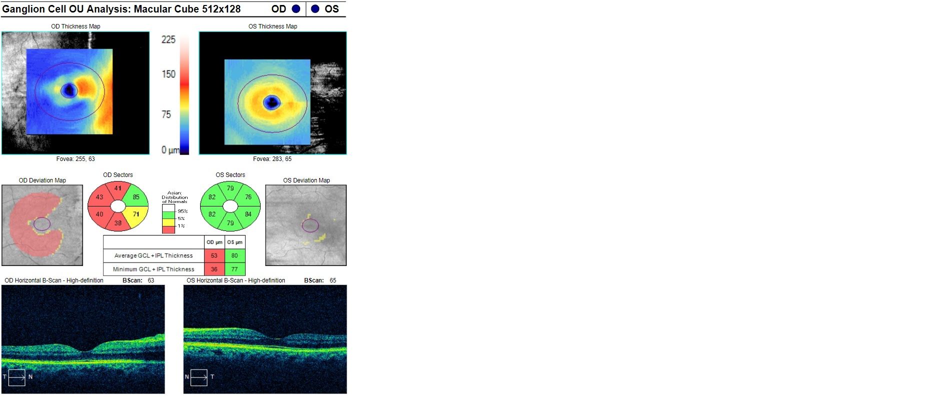 Gambaran OCT papil-ganglion pada pasien dengan edema papil mata kanan. Courtesy of dr Valenchia, SpM, ChM |