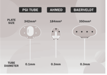 Dua GDD yang paling sering digunakan adalah Ahmed Glaucoma Valve dan Baerveldt Glaucoma Implant. Paul Glaucoma Implant adalah salah satu GDD baru tanpa katup yang dirancang oleh Profesor Paul Chew dalam upaya mengoptimalkan kemanjuran dengan profil keamanan yang secara teoritis lebih tinggi.Di Indonesia Virna Glaucoma implant (VGI) merupakan implan berbahan polymethylmethacrylate (PMMA) dengan desain yang dibuat untuk memudahkan untuk pemasangan pada mata Asia