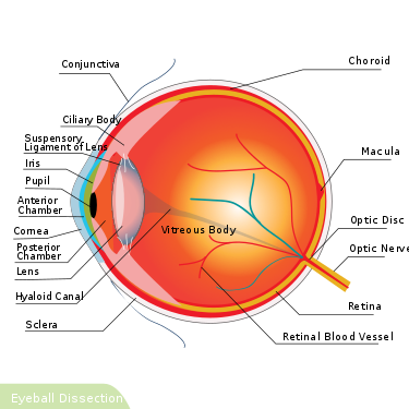 Proto-mata pertama di antara hewan berevolusi 600 juta tahun silam sekitar ledakan Kambrium.[4] Nenek moyang terakhir dari hewan memiliki perangkat biokimia yang diperlukan untuk penglihatan, dan mata lebih maju berkembang pada 96% dari spesies hewan pada enam dari ~35[a] filum utama.[1] Pada kebanyakan vertebrata dan beberapa moluska, mata bekerja dengan memungkinkan cahaya untuk masuk dan memproyeksikannya pada panel sel peka cahaya, yang dikenal sebagai retina, di belakang mata. Sel kerucut (untuk warna) dan sel batang (untuk kontras cahaya rendah) pada retina mendeteksi dan mengkonversi cahaya menjadi sinyal saraf untuk penglihatan. Sinyal visual tersebut kemudian diteruskan ke otak melalui saraf optik. Mata biasanya berbentuk seperti bola, diisi dengan zat seperti gel transparan yang disebut badan bening, dengan lensa pemfokus dan sering dengan suatu selaput pelangi; relaksasi atau kontraksi otot-otot di sekitar selaput pelangi mengubah ukuran pupil, sehingga mengatur jumlah cahaya yang masuk ke mata,[5] dan mengurangi aberasi ketika terdapat cahaya yang cukup.[6] Mata pada kebanyakan sefalopoda, ikan, amfibi, dan ular telah memiliki bentuk lensa yang tetap, dan memfokuskan penglihatan yang diperoleh dengan lensa teleskopik—serupa dengan cara kamera berfokus.[7]