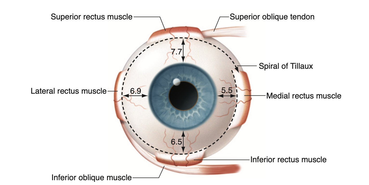 Spiral of Tillaux dari Mata Kanan Jarak insersi dalam milimeter merupakan nilai maksimum yang dapat bervariasi antar individu (Ilustrasi oleh Christine Gralapp). Gambar referensi dari Basic and Clinical Science Course, Section 6. Pediatric Ophthalmology and Strabismus. American Academy of Ophthalmology. San Francisco: 2022-2023 edition, 21.