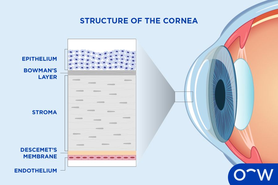 Kornea, yang merupakan struktur transparan tanpa pembuluh darah, memainkan peran penting dalam melindungi komponen internal mata dan memberikan kontribusi signifikan terhadap dua pertiga kekuatan refraktifnya. Kornea yang cembung, terletak sebagai bagian terdepan dari bola mata, memiliki diameter sekitar 11,5 mm; ketebalannya bervariasi mulai dari pusat, yang berukuran 550 hingga 565 μm, hingga ke tepi yang berkisar antara 610 hingga 640 μm. Kornea memiliki banyak serabut saraf yang berasal dari jaringan saraf siliari panjang yang berasal dari cabang oftalmik saraf trigeminal (lihat Gambar: Kornea, Iris, dan Lensa, Gambar Slitlamp).